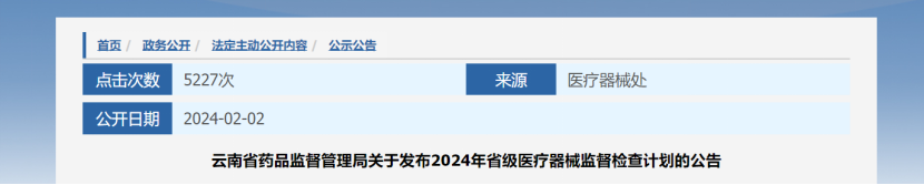 其中,云南省药监局发布了《2024年省级医疗器械监督检查计划》,检查范围包括医疗器械生产企业、医疗器械临床试验机构及医疗器械网络交易第三方平台,其中公布了详细的检查名单。